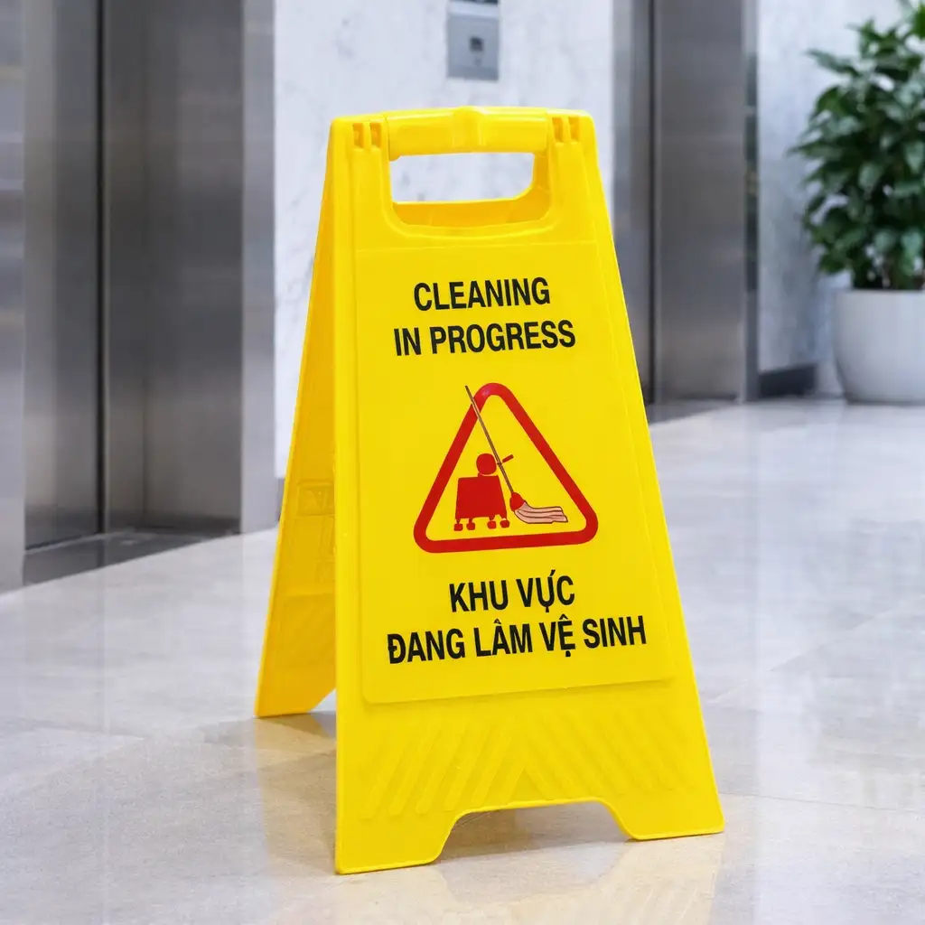 Trong môi trường khách sạn cao cấp, dịch vụ vệ sinh thường diễn ra liên tục để đảm bảo sự sạch sẽ tuyệt đối. Một chiếc biển báo được đặt một cách gọn gàng, đúng chỗ trong lúc lau dọn hành lang hay sảnh đợi không chỉ cảnh báo nguy hiểm mà còn là một phép lịch sự tinh tế. Nó thay lời xin lỗi và thông báo trước cho khách về sự bất tiện tạm thời, khiến họ cảm thông và đánh giá cao sự tận tâm của khách sạn. Sự chuyên nghiệp này góp phần quan trọng vào việc xây dựng thương hiệu và nâng cao điểm đánh giá từ khách hàng.